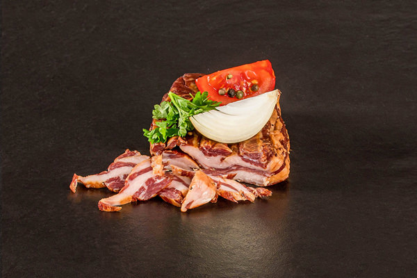Speck durchwachsen vom Wildschwein mit deftigen Gewürzen und Pöckelsalz, geräuchert über Holzrauch.